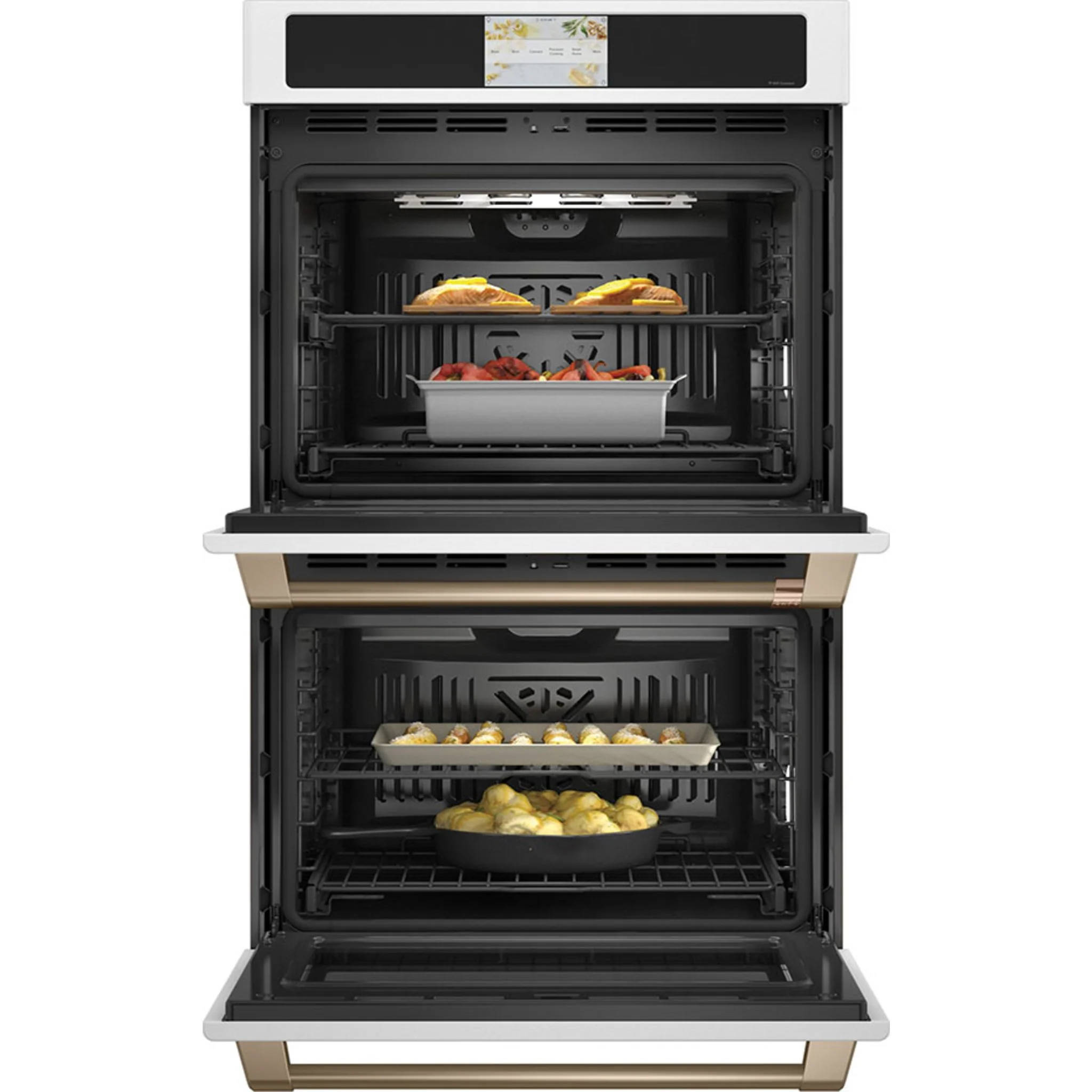 Café 30" Built-In Convection Double Wall Oven Matte White - CTD90DP4NW2 WiFi Connect, In-Oven Camera, Glass-Touch Control, True European Convection with Direct Air (Both Ovens), Self Clean with Steam Clean Option, Customizable Handles, Soft-Close Hinges