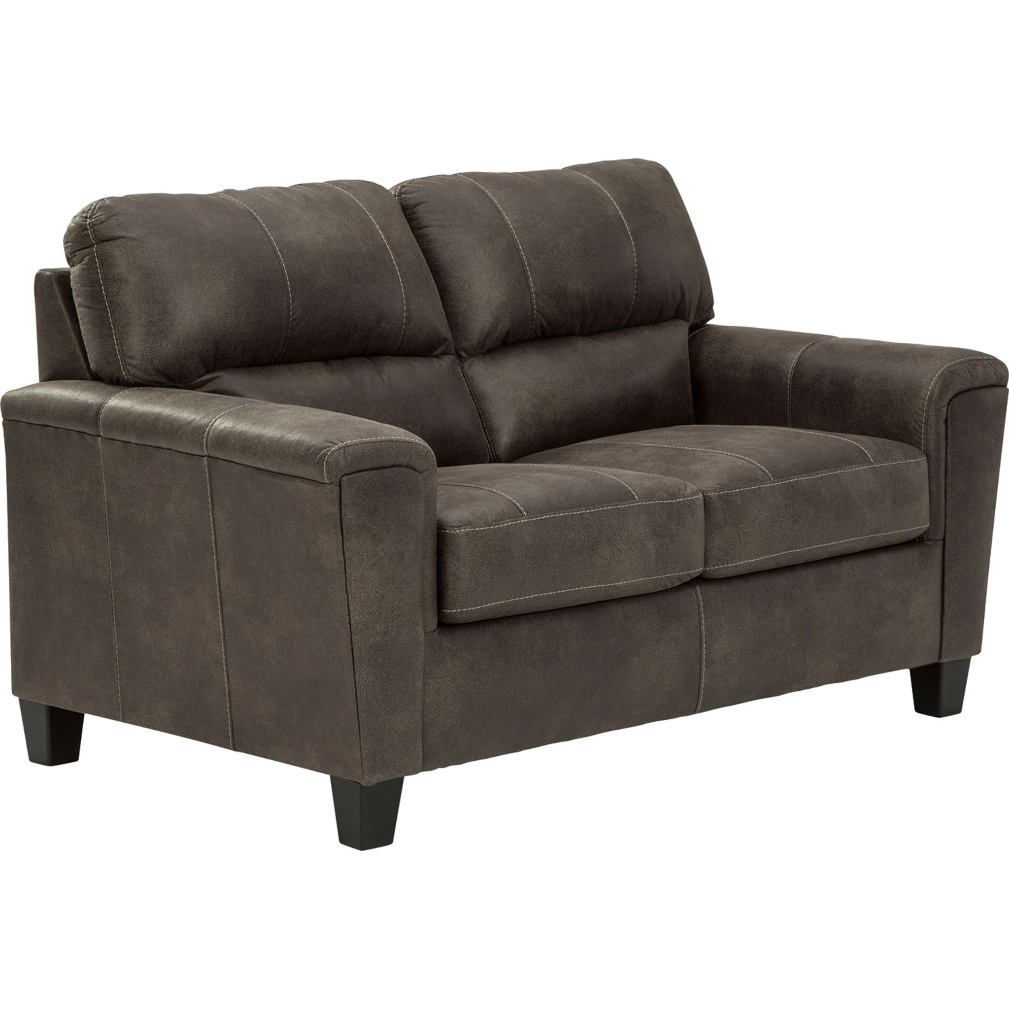 If you love the cool look of leather but long for the warm feel of fabric, you can take comfort in this loveseat. Wrapped in a fabulous faux leather with a weathered hue and hint of pebbly texture to resemble the real deal, this decidedly modern loveseat proves less is more. Elements include angled side profiling and track armrests wrapped with a layer of pillowy softness for that little something extra. Prominent jumbo stitching and clean-lined divided back styling lend fashion-forward flair.