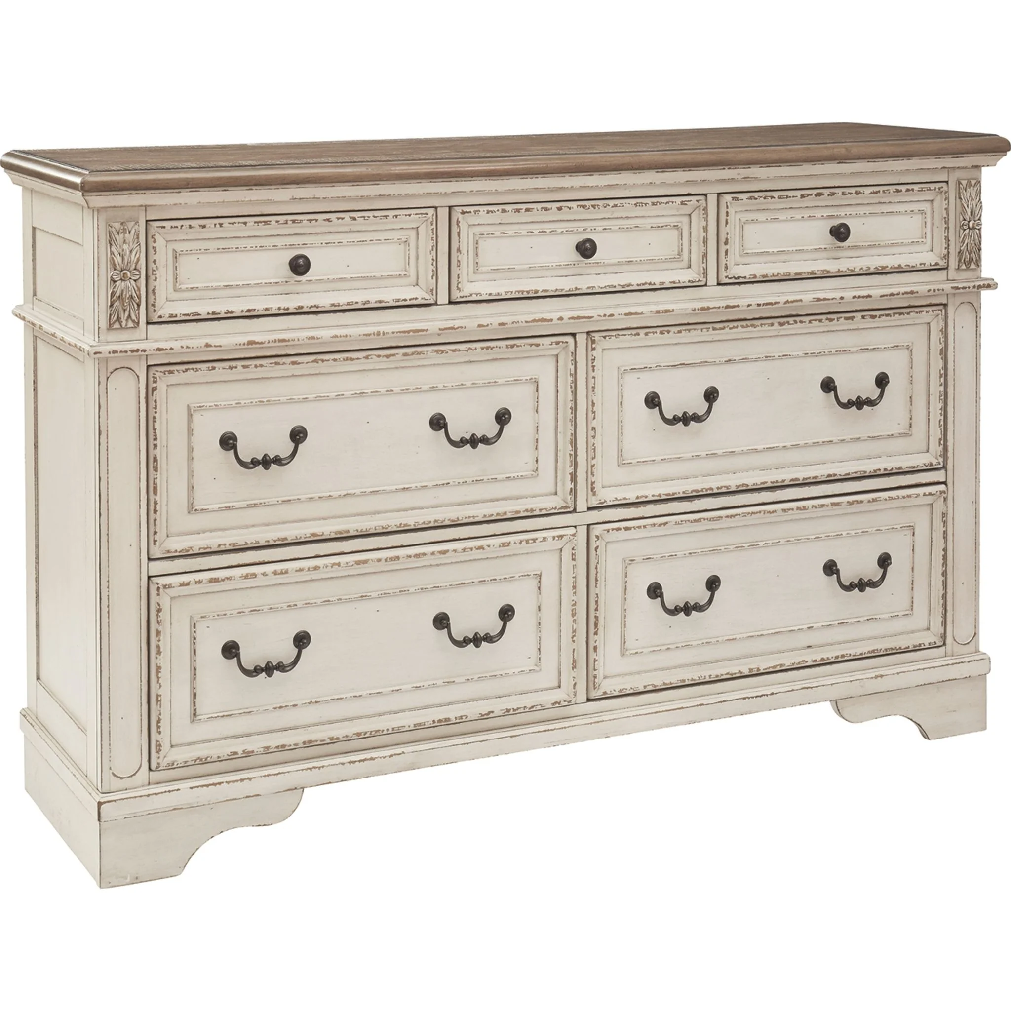 Elevating the art of traditional cottage styling, this dresser is your dream bedroom retreat realized. Antiqued two-tone aesthetic blends a chipped white with a distressed wood finished top for added charm. Framed drawer fronts and decorative corbels add refinement, while bail pulls in a dark bronze-tone finish lend a classic touch.