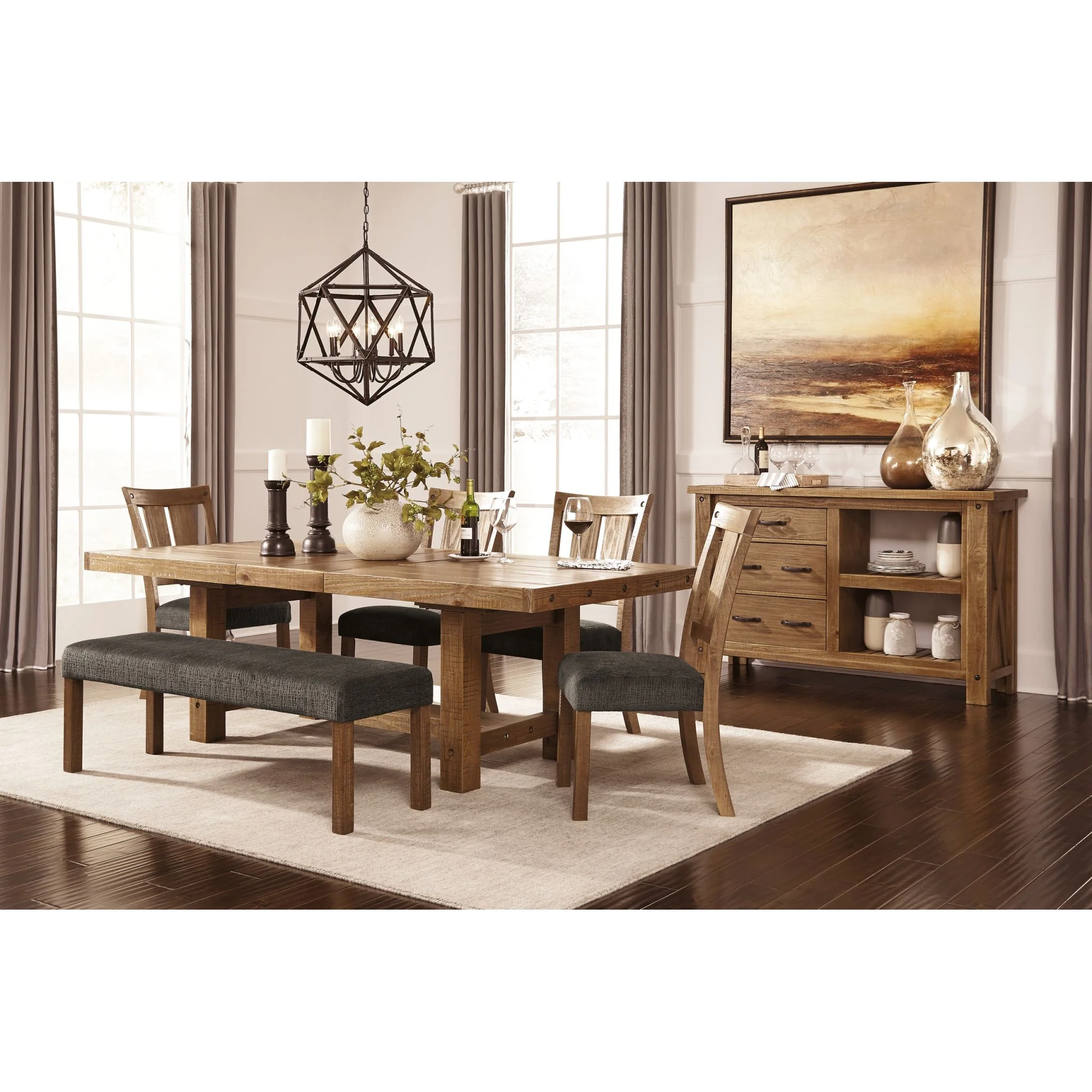 Indulge the senses with this upholstered dining room bench. Finished in a light and natural honey-tone hue, the clean-lined, blocky legs strike a pose. Highly textured with a raised meandering pattern, the richly neutral upholstery brings a fresh, organic sensibility to the table.